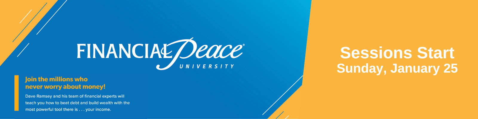If you’re ready to gain confidence with your money and build a stronger financial future, we invite you to join Financial Peace University — a proven, practical course led by Dave Ramsey and his team of financial experts. This class will help you create a plan to eliminate debt, save for the future, and build lasting financial habits using straightforward, biblical principles. Sessions run Sundays, January 25 – April 12 5:00–7:00 PM Whether you’re just getting started or looking to strengthen your financial foundation, this is a great opportunity to take control of your finances and experience real peace.